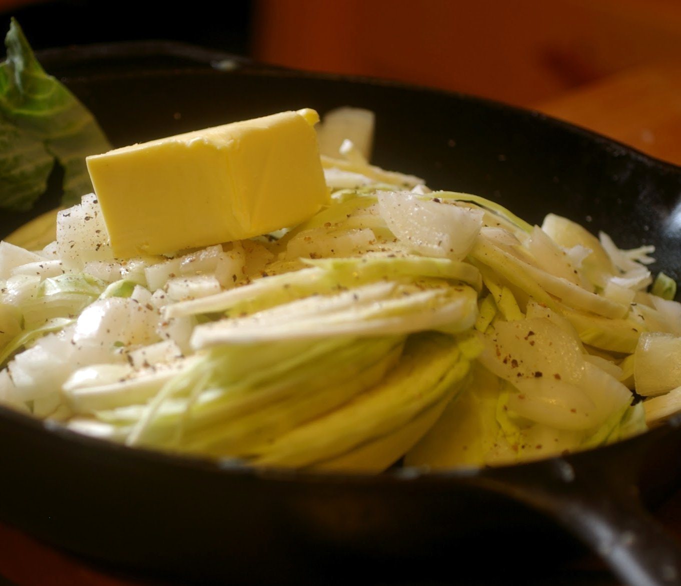 Put the other half of the butter in a frying pan with the cabbage, salt and onions. Cook on medium until tender about 15 minutes.