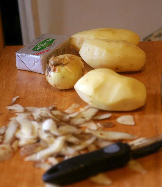 Peel and chop your potatoes, onion and cabbage. Put the potatoes in a pot and cover with water. Bring to a boil and allow to cook for 10-15 minutes.